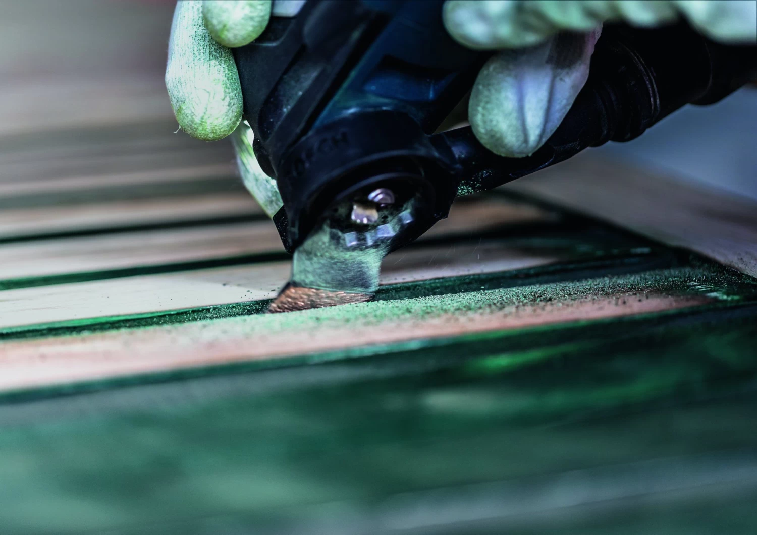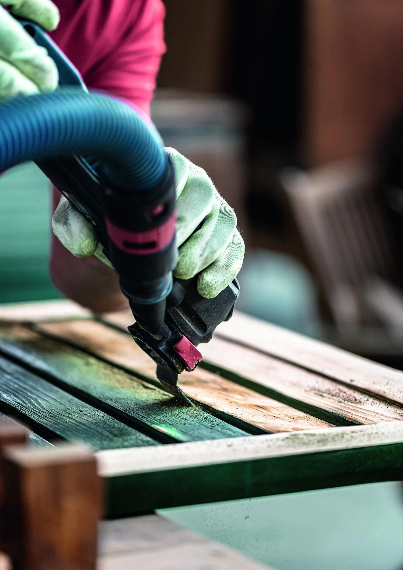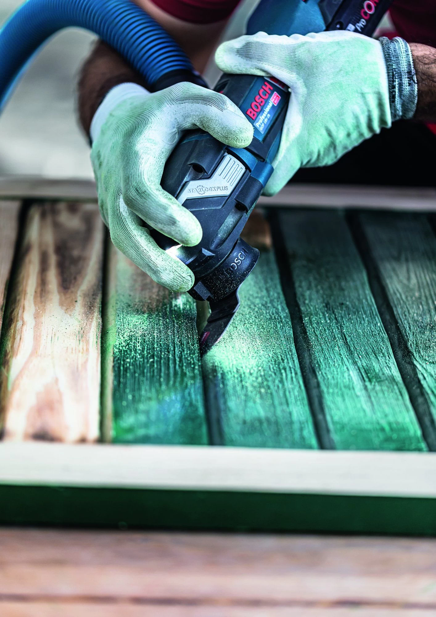 Krappe openingen in terrasplanken, luiken of oude trappen zijn erg moeilijk met de hand te schuren zijn, meestal krijg je een splinter in je vingers. Met de Expert Sanding Finger is dit soort schuurwerk eenvoudig: het dunne, spitse zaagblad past in de kleinste ruimtes en schuurt snel en effectief met zijn hoogwaardige hardmetalen korrel.