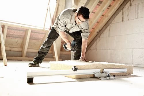 Hoeknauwkeurig en maatnauwkeurig zagen van flexibel isolatiemateriaal – in combinatie met de geleiderail en de hoekaanslag FS-WA-ISC