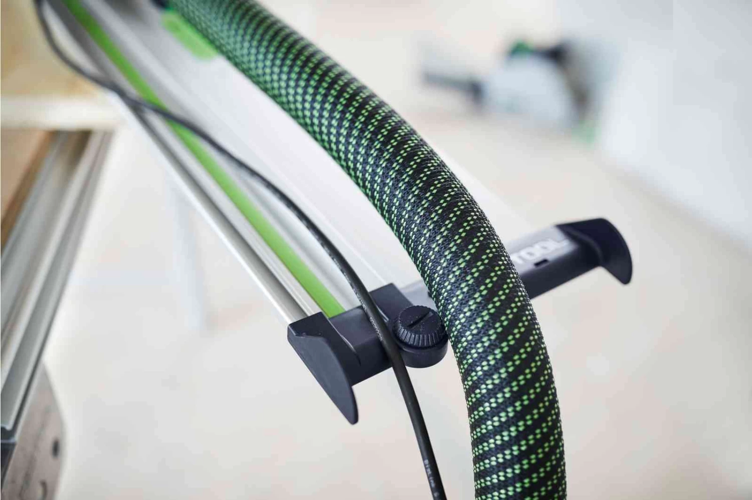 - voorkomt dat afzuigslang en kabel aan het uiteinde van de geleiderail blijven haken