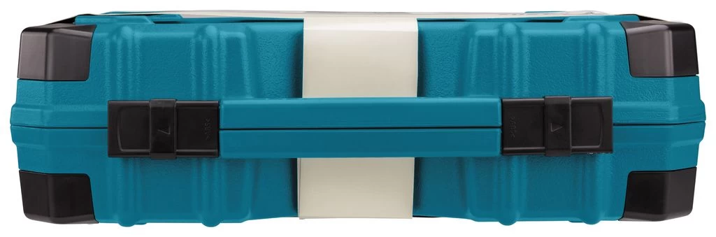 Uitgebreide Makita gereedschapsset in een goed gesorteerde koffer, die dankzij versterkte hoeken en twee sluitingen ook bestand is tegen zware omstandigheden.