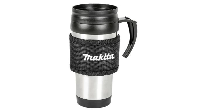 Deze thermosbeker met houder is heeft een inhoud van 330 ml en is voorzien van een deksel met flip-top systeem. De houder is gemaakt van sterk polyester en is te bevestigen aan een (gereedschaps)riem zodat drinken altijd binnen handbereik is.